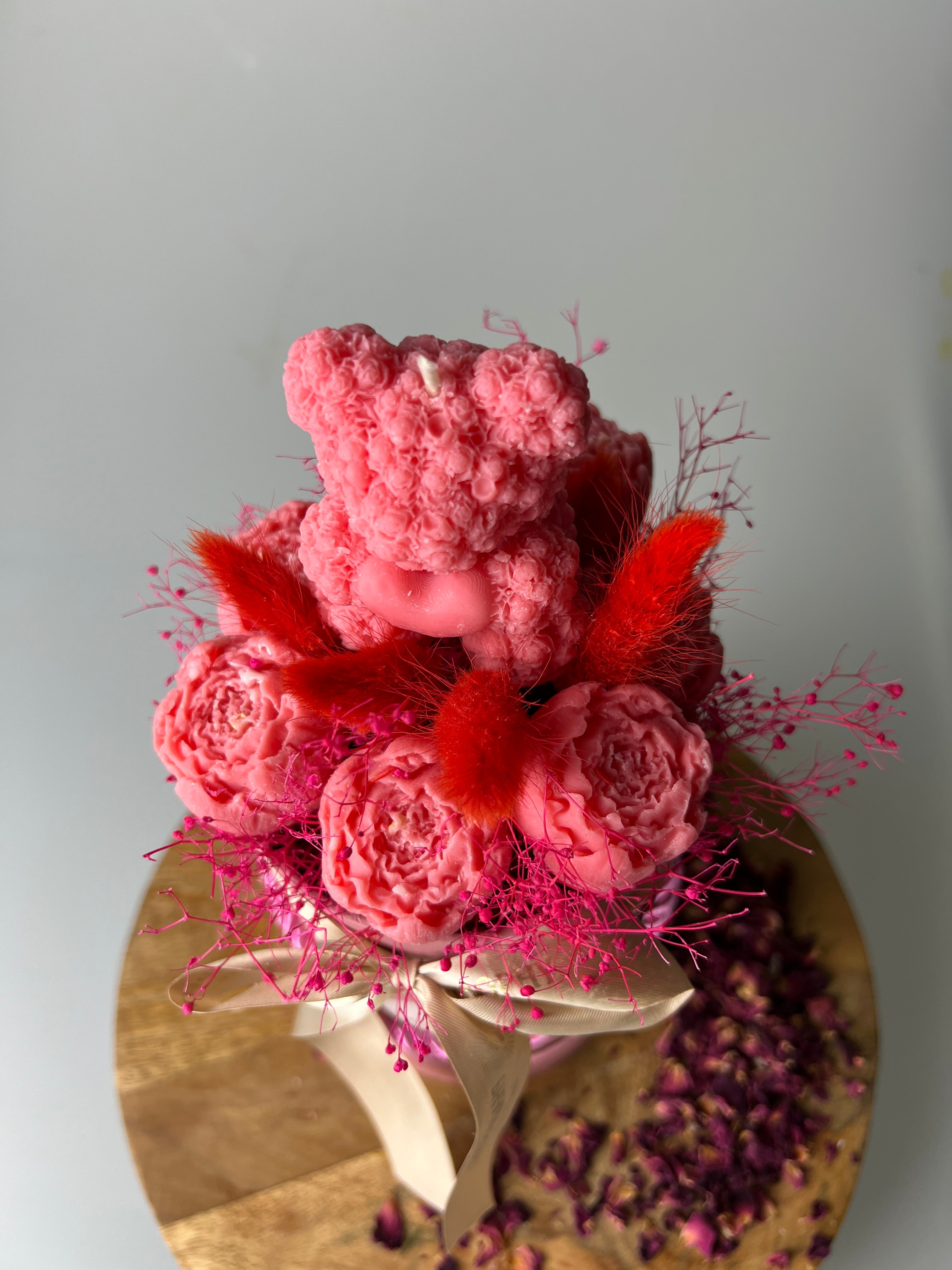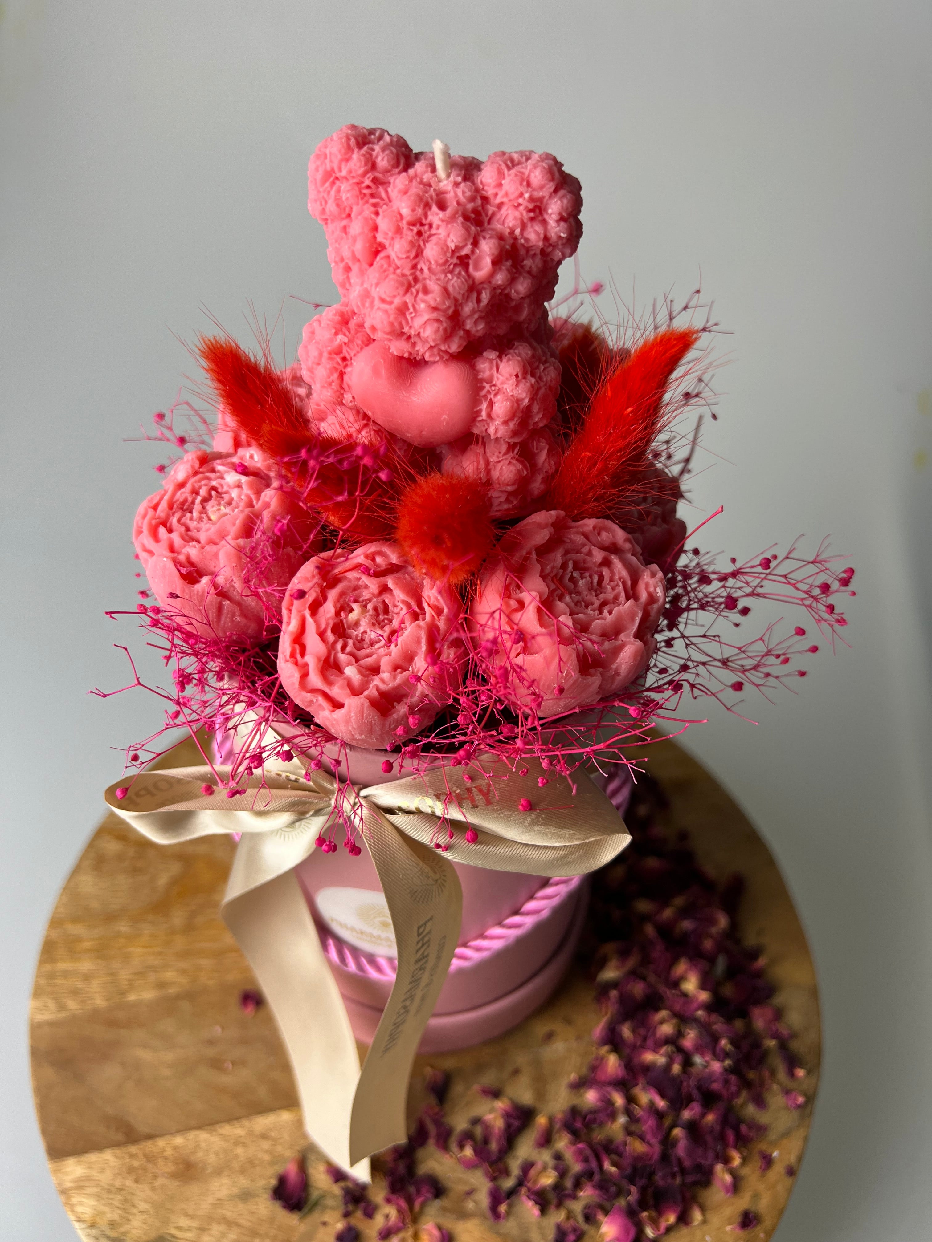 Bukiet zawiera: świecę sojową misia z sercem oraz 7 wosków zapachowych mini piwonii, całość w wybranym zapachu.