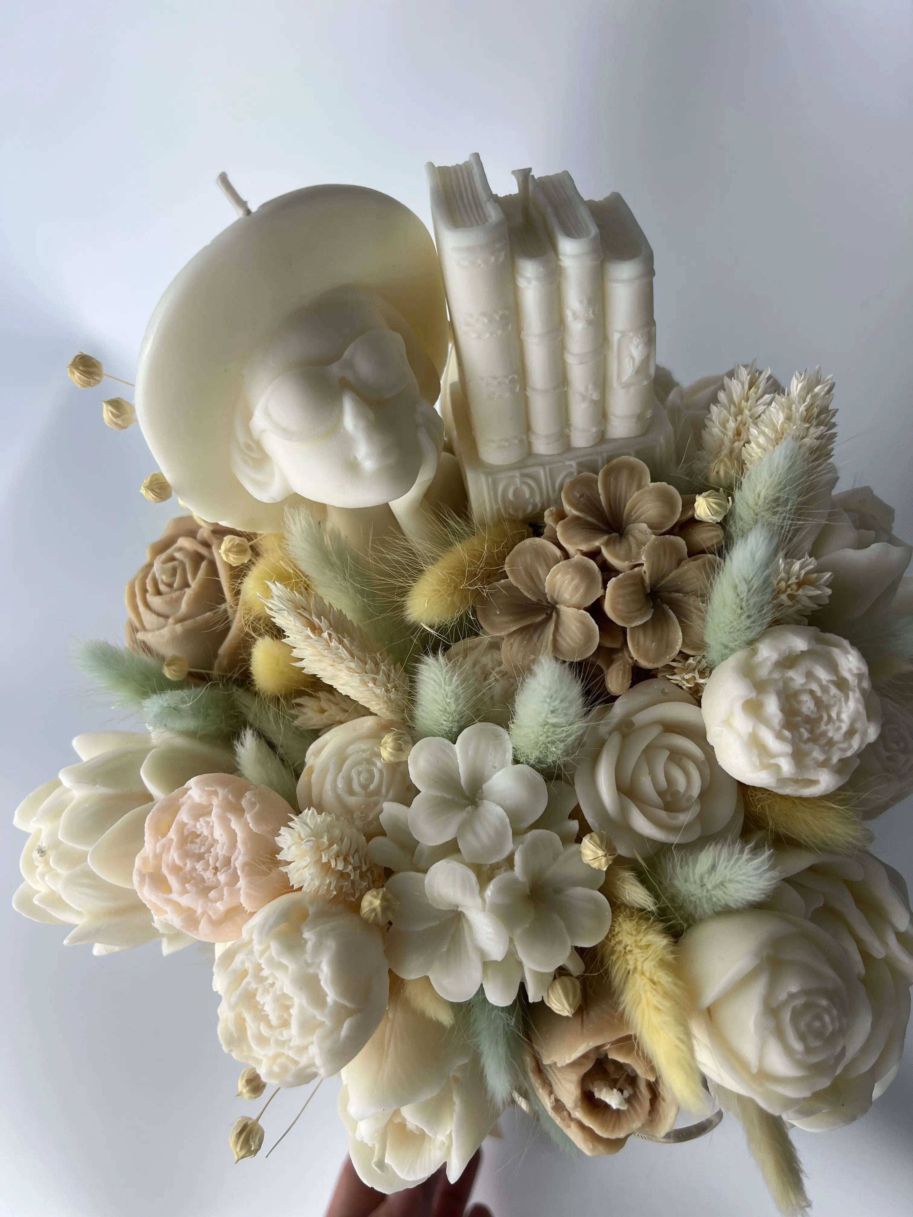 Bukiet zawiera świece sojowe Dama w kapeluszu, Książki, dziesięć świec sojowych kwiatowych oraz siedem wosków, całość w wybranym zapachu. Świece po wyjęciu z bukietu i usunięciu drewnianego patyczka, można zapalić, umieszczając na podstawce, z dala od materiałów łatwopalnych. Woski zapachowe umieszczone kominku zapachowym topią się nadając cudownego aromatu.