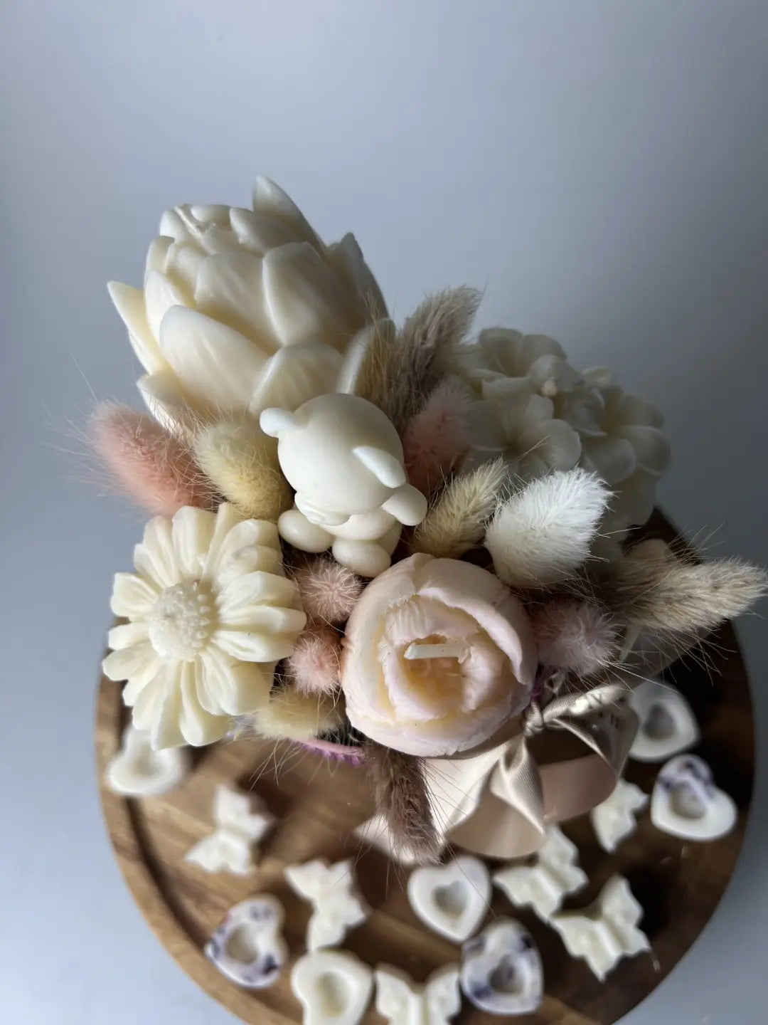 Bukiet zawiera dwie kwiatowe świece oraz woski zapachowe: mini piwonie, miś, stokrotkę i fiołki o wybranym zapachu.