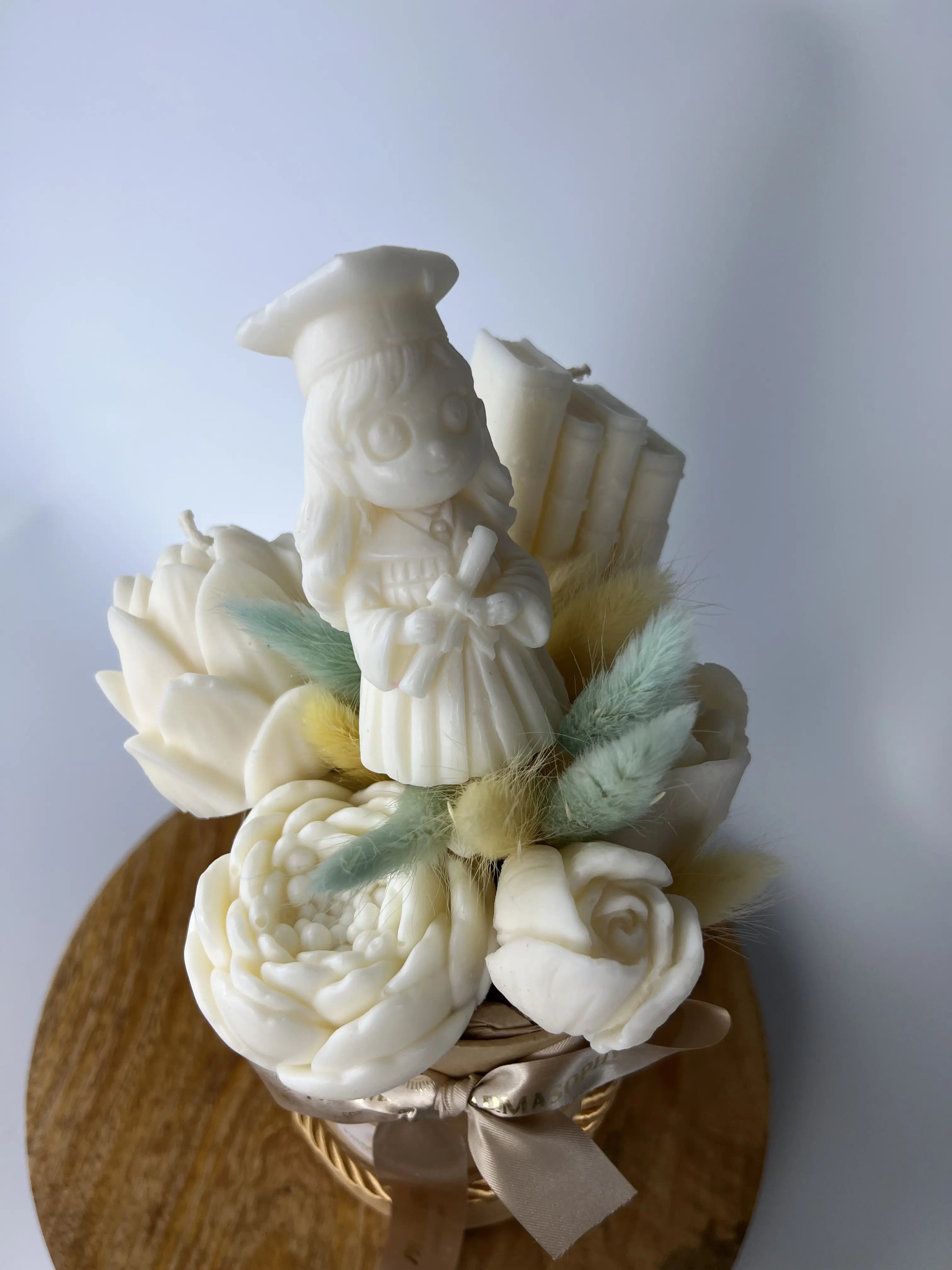 Bukiet zawiera świece sojowe Uczennica, Książki, cztery świece kwiatowe, całość w wybranym zapachu. Świece po wyjęciu z bukietu i usunięciu drewnianego patyczka, można zapalić, umieszczając na podstawce, z dala od materiałów łatwopalnych. Woski zapachowe umieszczone kominku zapachowym topią się nadając cudownego aromatu.