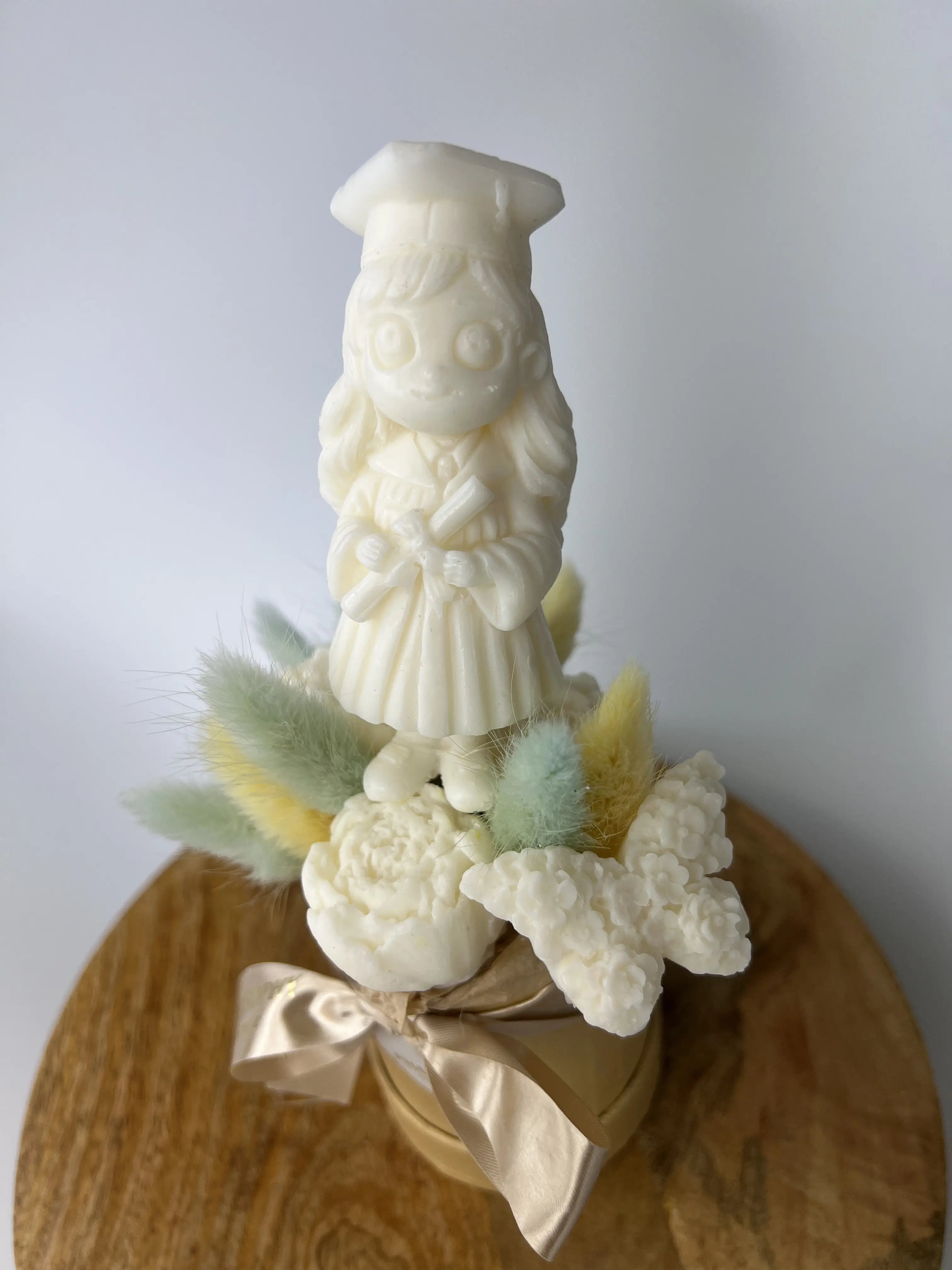 Bukiet zawiera świecę sojową Uczennica, trzy woski zapachowe mini piwonie oraz jeden wosk motylek, całość w wybranym zapachu. Woski zapachowe umieszczone kominku zapachowym topią się nadając cudownego aromatu.
