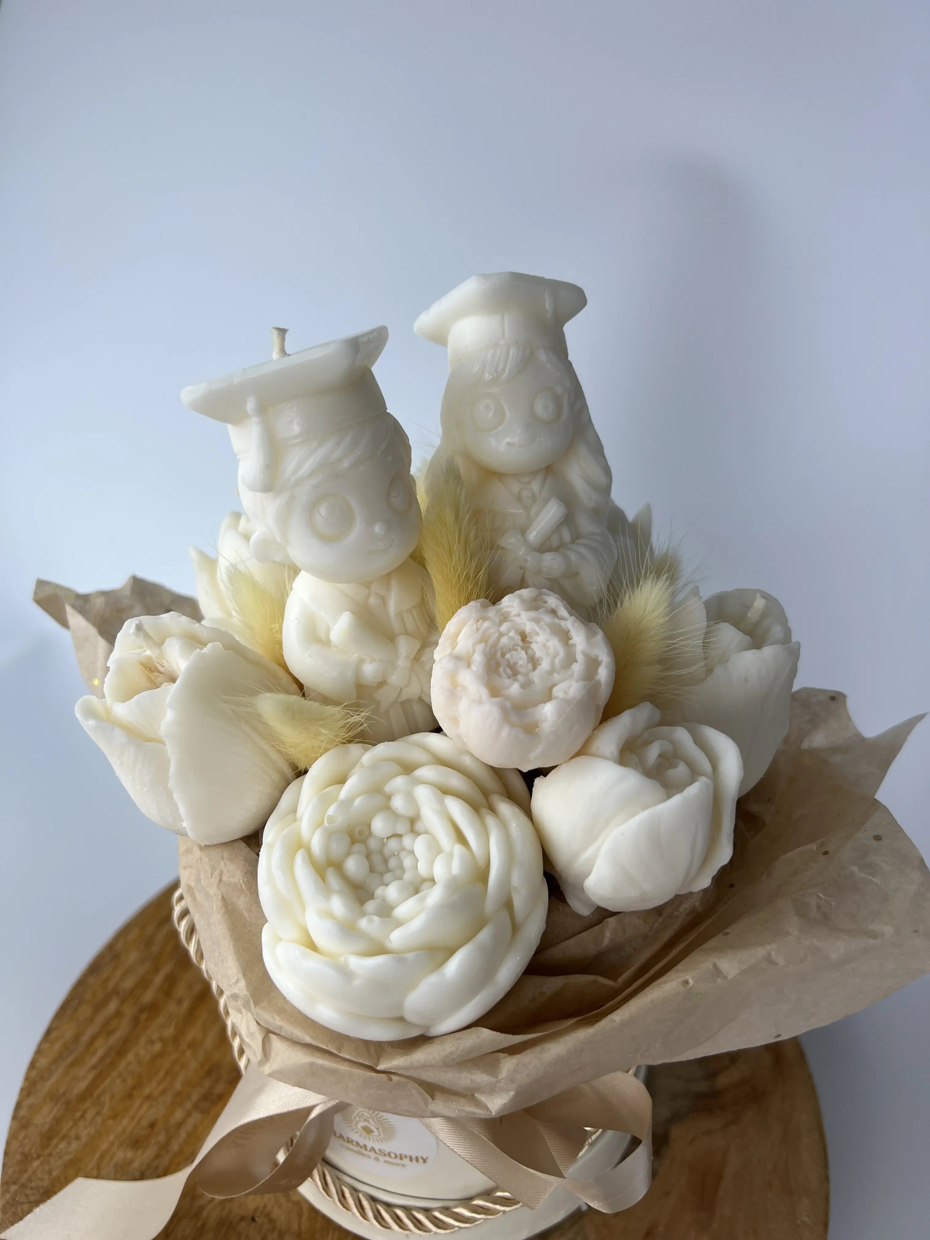 Bukiet zawiera świece sojowe Uczennica oraz Uczeń, sześć świec kwiatowych oraz wosk piwonia, całość w wybranym zapachu. Świece po wyjęciu z bukietu i usunięciu drewnianego patyczka, można zapalić, umieszczając na podstawce, z dala od materiałów łatwopalnych. Woski zapachowe umieszczone kominku zapachowym topią się nadając cudownego aromatu.