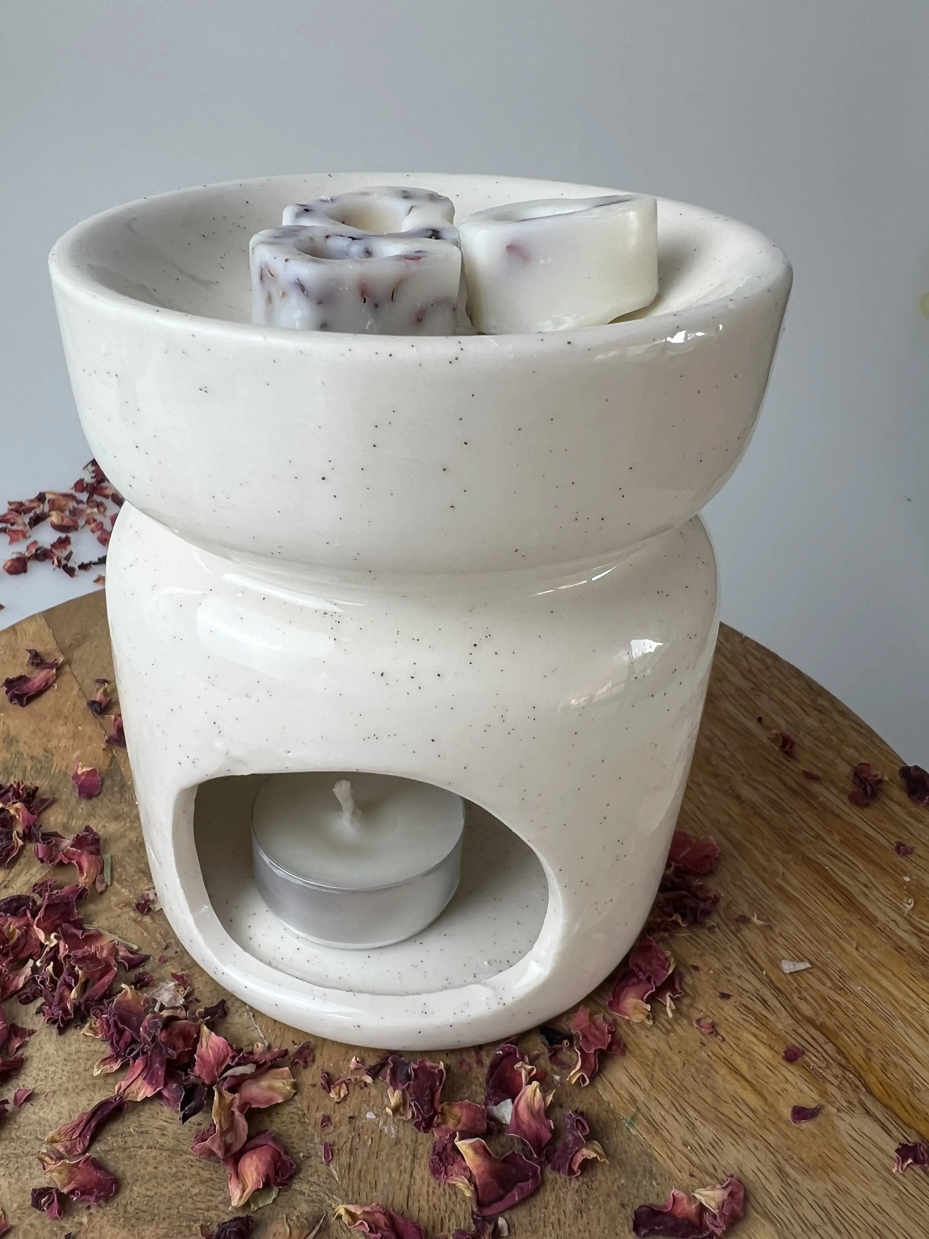 W górnej części kominka, w misce umieszczamy wosk zapachowy, w dolnej umieszczamy sojowy t-light i zapalamy go. Ciepło palącego się t-lighta ogrzewa misę z woskiem, który topiąc się otula nas wspaniałym aromatem.