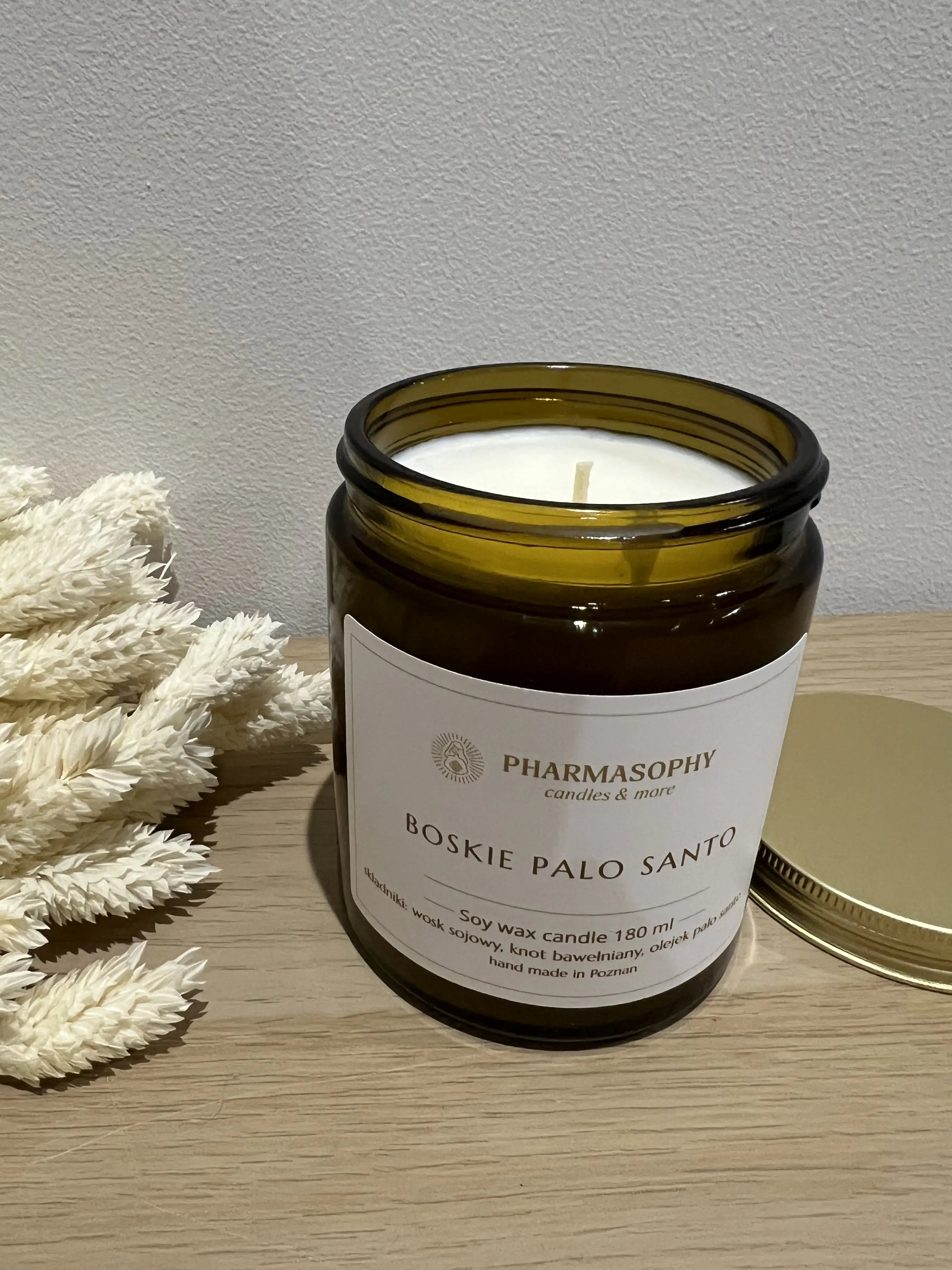 180ml naturalnego wosku sojowego, ręcznie zalanego w szklanym brązowym słoiku, aromatyczny olejek palo santo oraz bawełniany knot polskiej produkcji.