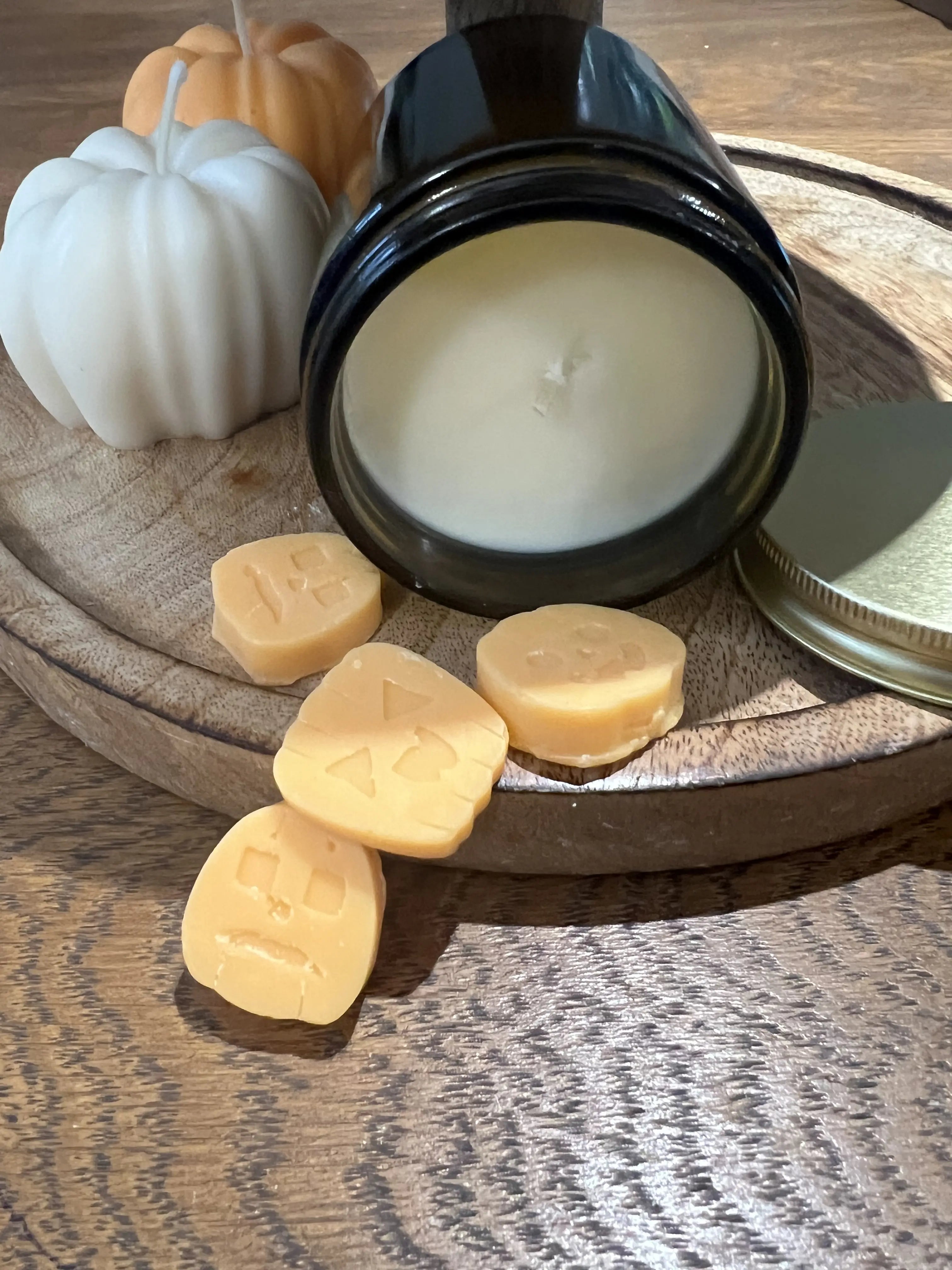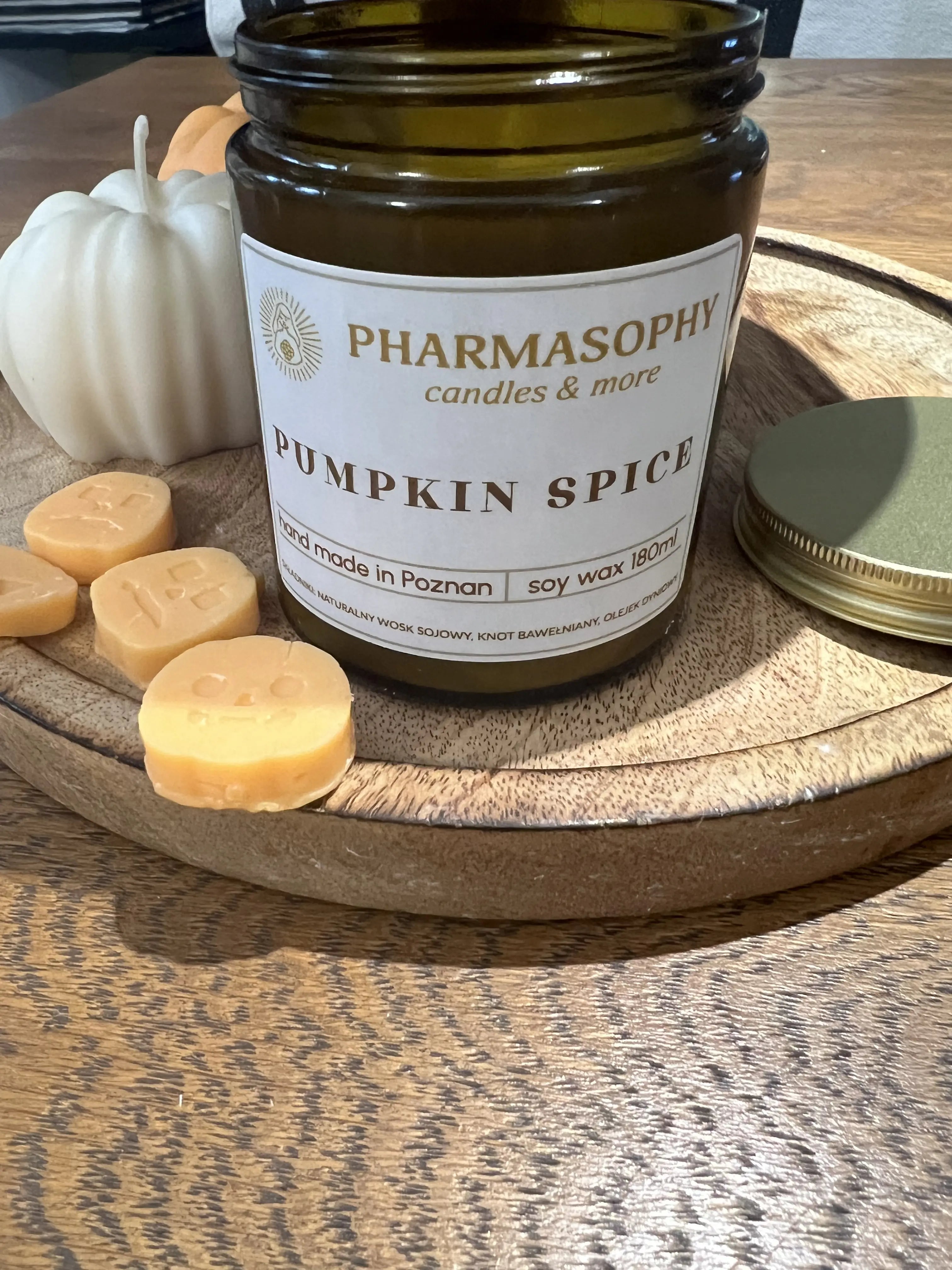 180ml naturalnego wosku sojowego, ręcznie zalanego w szklanym brązowym słoiku, aromatyczny olejek dyniowy oraz bawełniany knot polskiej produkcji.