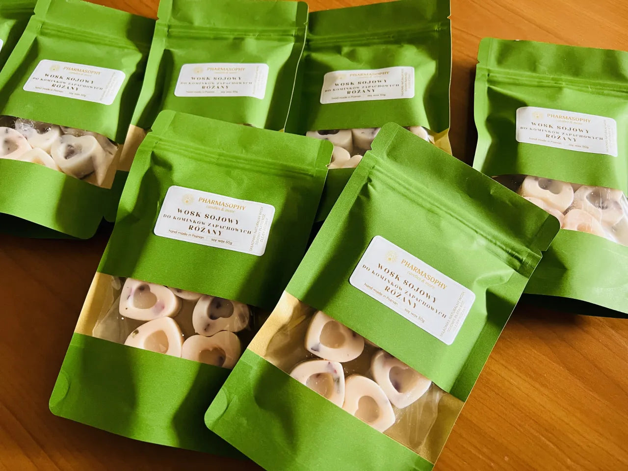 Pachnący naturalny wosk sojowy do rozpuszczenia w kominku zapachowym. Prezentujemy zapach różany z płatkami róż, możliwy jest wybór innej kompozycji: