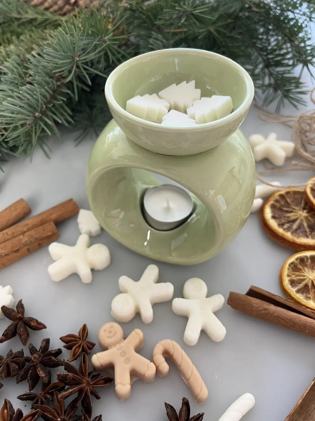 Zestaw zawiera wybrany kominek zapachowy oraz opakowanie wybranego świątecznego zapachu 30 g naturalnego wosku sojowego w kształcie piernikowego ludzika oraz świątecznej laseczki z aromatycznym olejkiem piernikowym lub w kształcie świątecznej choinki z pachnącym olejkiem świątecznej choinki.