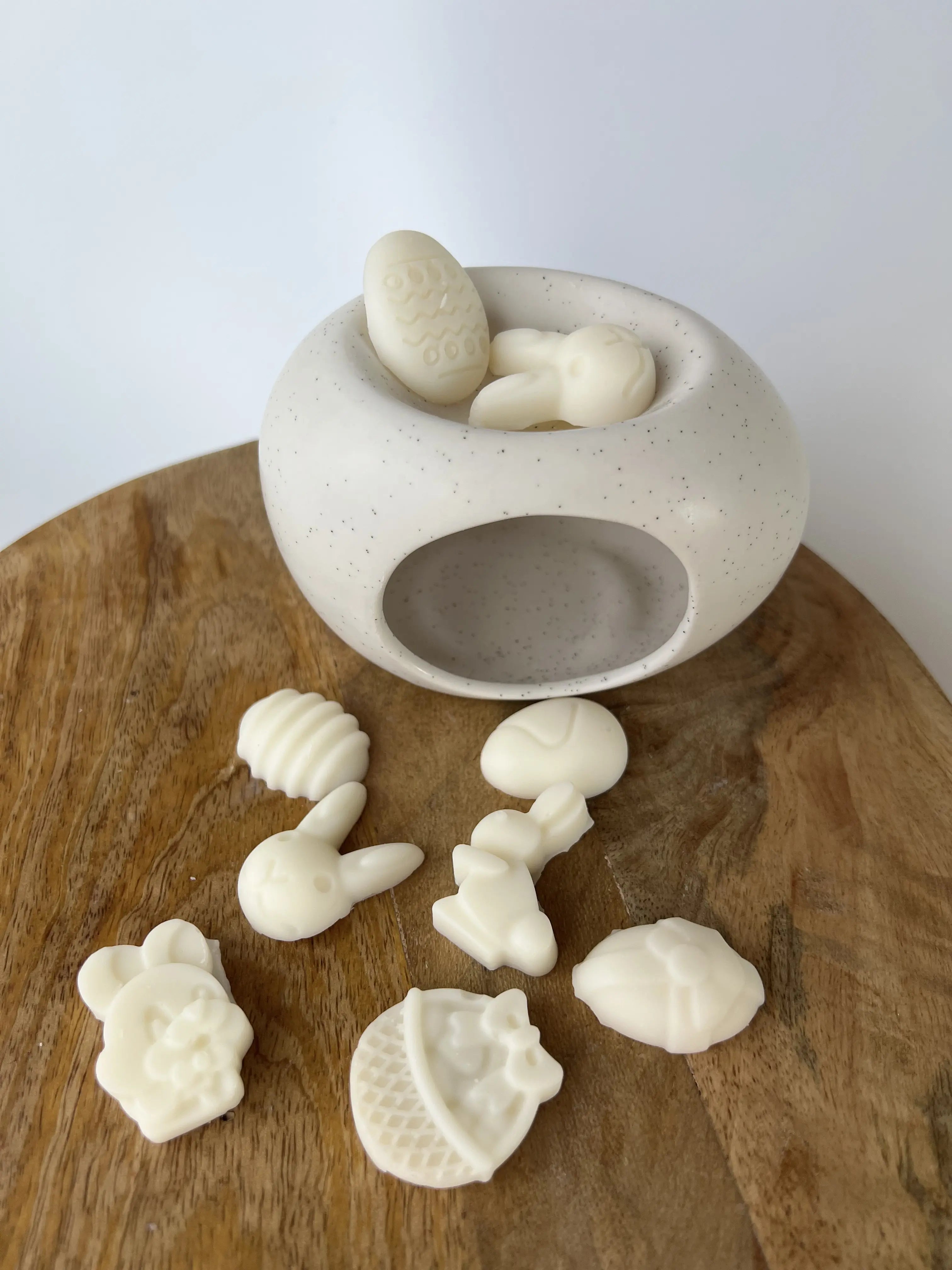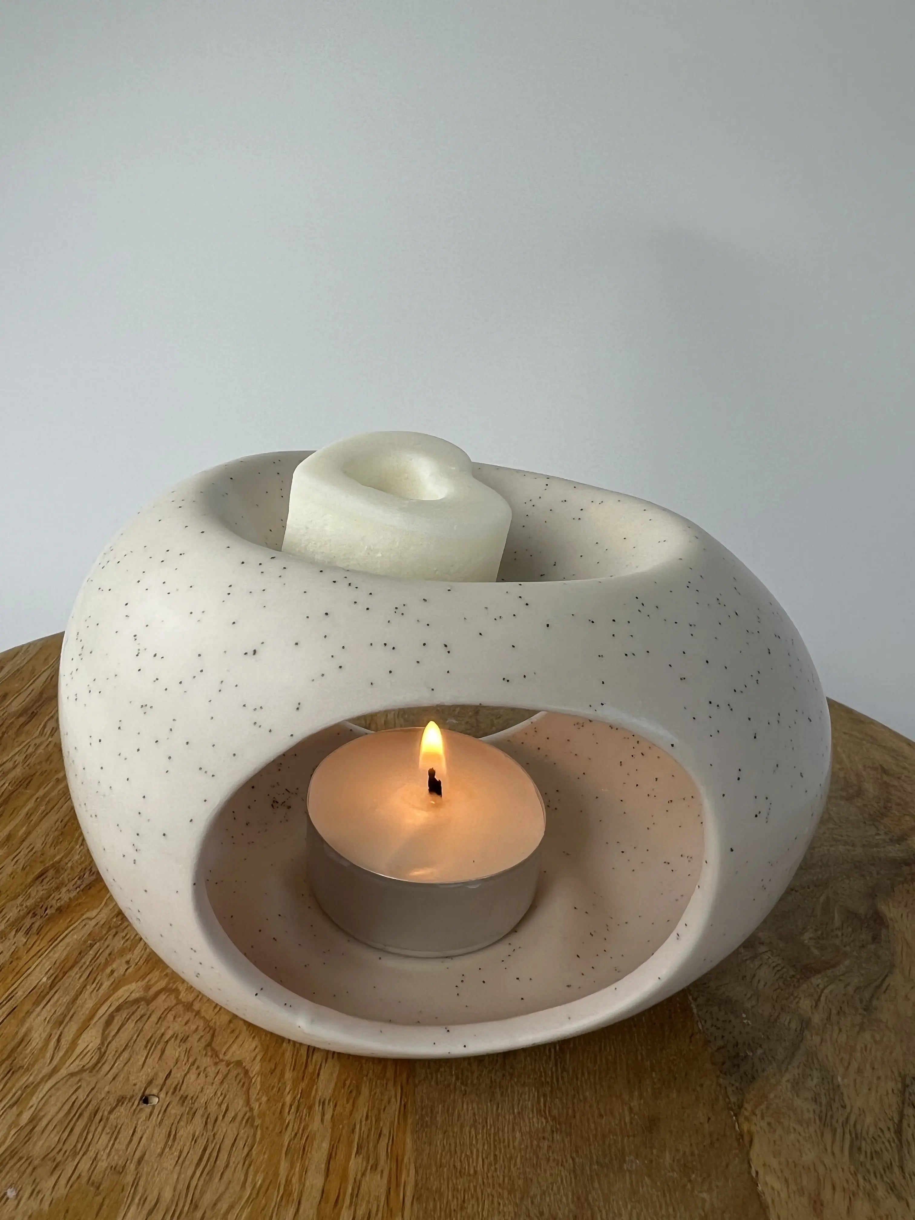 Zestaw prezentowy zawiera minimalistyczny kominek zapachowy wykonany z ceramiki w kolorze naturalnym ecru, z delikatnymi kropkami wraz z jednym sojowym t-lightem oraz opakowanie 50g wosków zapachowych o wybranym aromacie.