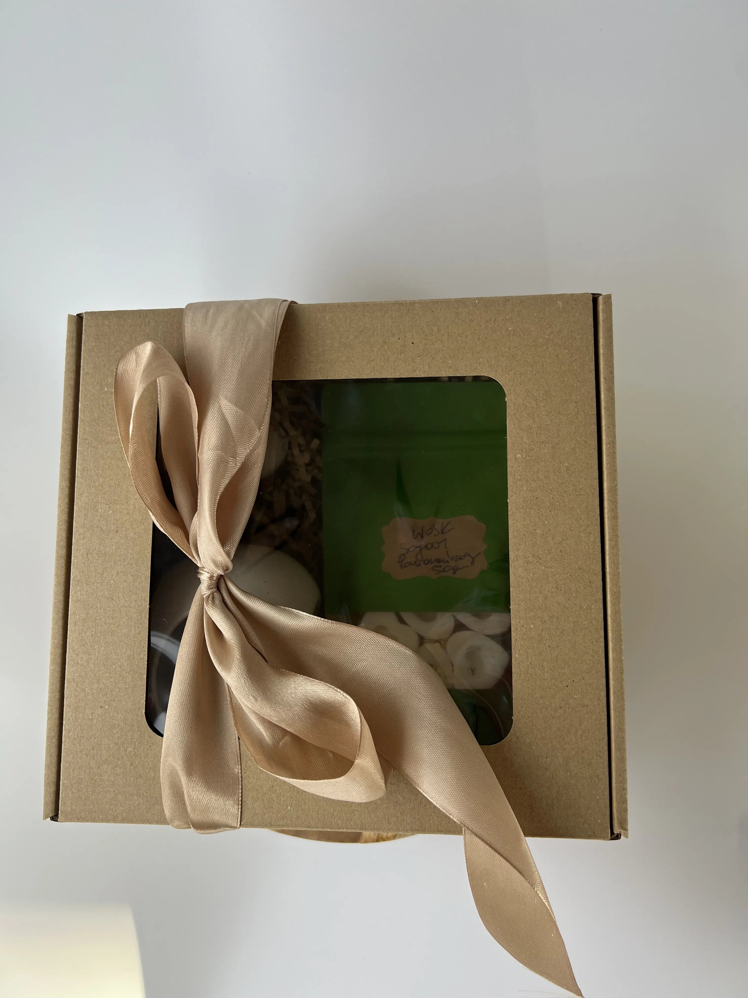 Zestaw zapakowany w pudełko prezentowe z okienkiem, przewiązane wstążką.